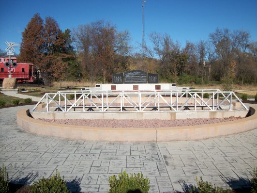 The memorial was erected on property obtained from Union Pacific Railroad, through the City of De Soto, on Fountain City Rd., at the north-end crossing. Histories of the three railroads for which the De Soto community has provided a home, were incorporated into the memorial. This location is easily accessible and provides ample parking.